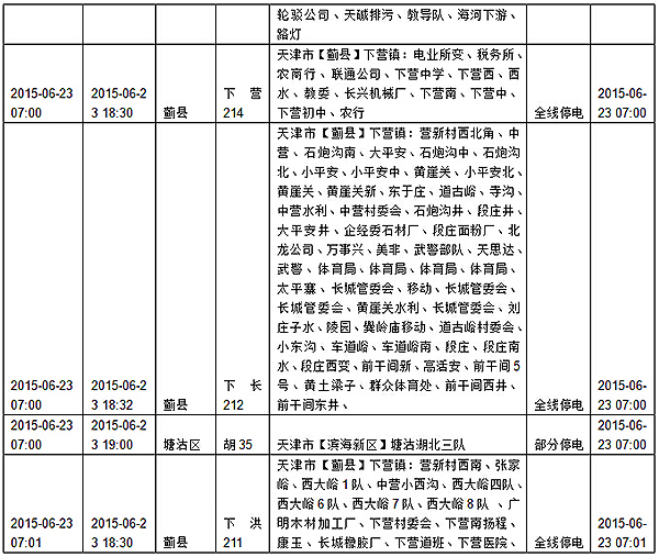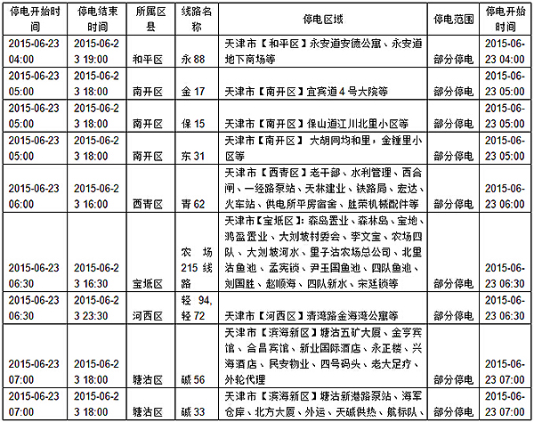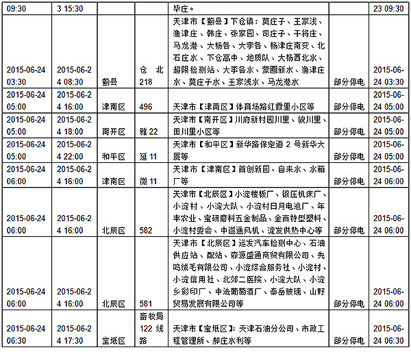 2015年6月15日至6月21日计划检修停电预告