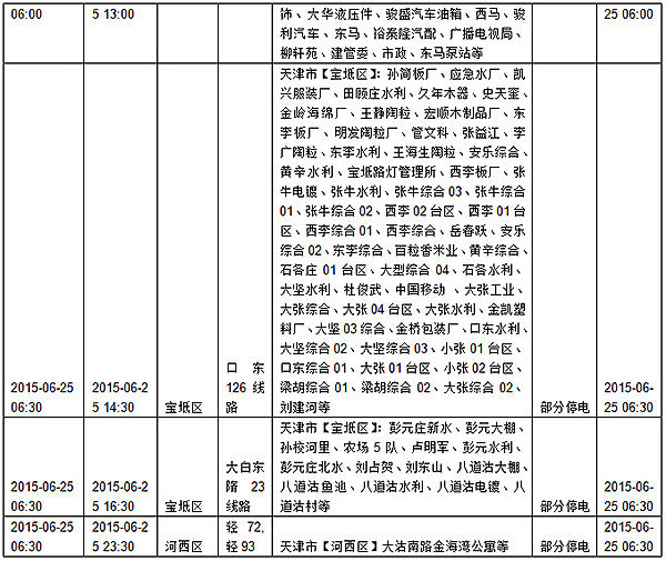 2015年6月22日至6月28日计划检修停电预告