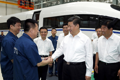 习近平说,这两年他走了很多国家,谈的最多的合作项目之一就是高铁。俄罗斯莫斯科到喀山的高铁建设,就是他同普京共同见证签署的项目。习近平希望高铁建设再接再厉、创新驱动,继续领跑、勇攀高峰,带动整个装备制造业形成比学赶帮超的局面。