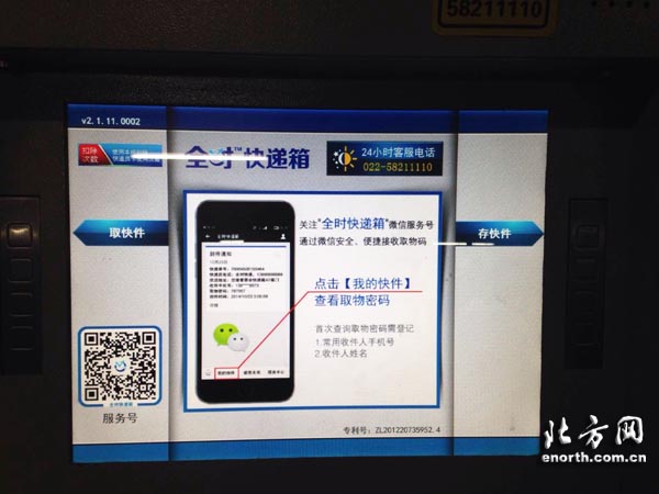 申通快递快递业务员张俊首先点击“投件”,之后输入了自己的手机号和投件码登录系统,根据快件大小选择投递中箱,并支付了开箱费0.5元,随后将快件放到扫描处扫描后,屏幕显示出运单号。快递员再输入北方网新媒体记者手机号后,点击“确认”,指定快件箱门就弹开了,存放好快件关上箱门,按照操作点击“成功”,2分钟的时间,快递存放过程即完成。随即北方网新媒体记者的手机便收到了短信验证码,再次来到触屏前,输入字母加数字的验证码,按下“确认”,门就打开了,随即取出快递。取件整个操作过程不到1分钟。