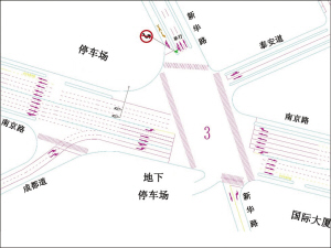 交通组织:拆除现状环岛,增设交通信号灯;将南京路西进口渠化调整为1条左转、1条可变、2条直行、1条直行右转和1条左转车道;在成都道与南京路西进口提前合流渠化一个进口道,并在第四条车道线上增加隔离护栏,变最外侧车道为辅道,由成都路驶出车辆可行驶辅道;将南京路西出口停止线提前,增加停车容量,提高通行秩序;将新华路(泰安道至保定道)一段调整为双向通行;去除南京路东进口部分护栏,增加1条左转车道。