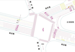 交通组织:拆除现状环岛,保持现状交通信号灯控制方式;将南京路西出口停止线提前,增加停车容量,提高通行秩序;将南京路西进口调整为禁止左转驶入湖北路;规范行人过街,提供行人安全过街设施;在公安医院前施划右转导流车道。