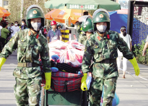 13日上午,王磊突然接到一道任务转换命令,他被安排前往后方开发区二小安置点维持秩序。“为什么让我撤下来?”对于这个命令,王磊多少有些抵触。在这里驻守了20年,他和战士们熟悉每条街道,对这片土地、百姓有着太深的感情。可当他到了开发区二小,心中的不快立即烟消云散。“受灾群众、志愿者及各类物资都在涌入、非常混乱,哭喊声、吵闹声、呼寻声交织成一片。”王磊马不停蹄地组织战士疏导交通、安置人员、发放物资,20多分钟就初步恢复了现场秩序。