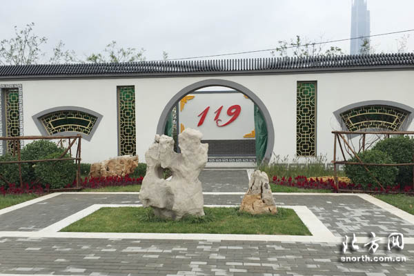 从地铁三号线学府工业园站走出来,沿着海泰大道步行约300米,在天津公安消防总队高新支队旁边,北方网新媒体记者走进了这座消防主题文化公园。远远望去,苏州园林风格的公园配上“119”三个红色的醒目数字显得别具特色,在公园的入口,矗立着“高新消防文化主题公园”的牌匾。
