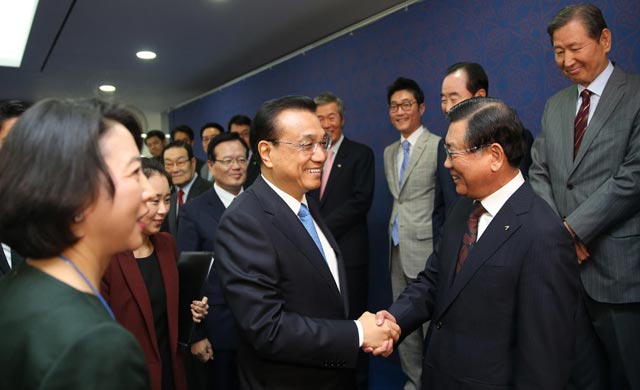 11月1日,国务院总理李克强在首尔国会议员会馆与韩国国会议长郑义和共同出席“中国旅游年”闭幕式并致辞。这是李克强在闭幕式前会见出席闭幕式的中韩嘉宾。