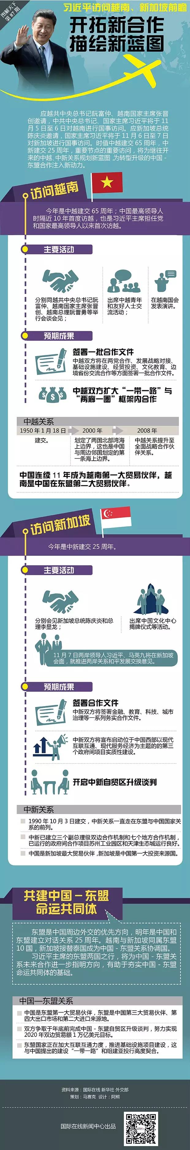 应越共中央总书记阮富仲、越南国家主席张晋创邀请,中共中央总书记、国家主席习近平将于11月5日至6日对越南进行国事访问。应新加坡总统陈庆炎邀请,国家主席习近平将于11月6日至7日对新加坡进行国事访问。时值中越建交65周年,中新建交25周年,重要节点的重要访问,将为继往开来的中越、中新关系规划新蓝图,为转型升级的中国-东盟合作注入新动力。