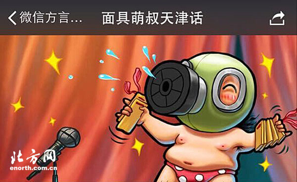 天津北方网讯:“打一晃、躲我介、搭个搭个呗……”近日,一个头戴防毒面具的萌叔操着一口纯正的天津方言,成为微信表情里的热门选项。萌叔憨态可掬的样子有没有萌翻你?作为天津人,看着这些被书面化的天津方言有种亲近感。