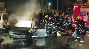 天津北方网讯:停在路边的一辆轿车起火,多家店铺纷纷伸出援手,借给司机六七个灭火器灭火。