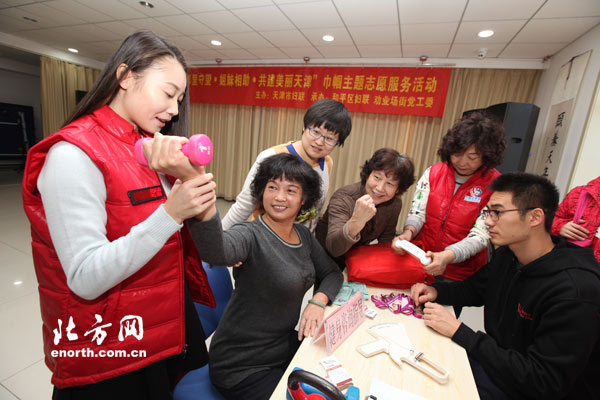 天津北方网讯:12月5日,市妇联在天津市和平区劝业场街新津社区举办天津市“邻里守望?姐妹相助?共建美丽天津”巾帼志愿服务主场活动。和平区委副书记李海军、市妇联副主席梁春早为全国三八红旗集体天津女子柔道队等巾帼志愿服务队授旗,与会领导为巾帼志愿者发放棉背心,巾帼志愿者代表宣读了倡议书,文明家庭代表与困难家庭结对子并为他们赠送了慰问品。专家学者代表、和平区各街妇联主席、巾帼志愿者、社区居民等100余人参加。服务项目包括常见病义诊、血压血糖测量、老年养生咨询等医疗保健类服务,清洗眼镜、美容染发等生活类服务,还有手工编织教学、科学健身指导、法律维权咨询、大篷车就业指导。现场还开展了十八届五中全会知识宣传等。