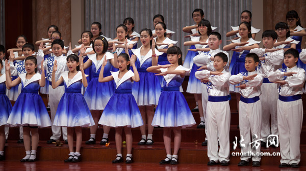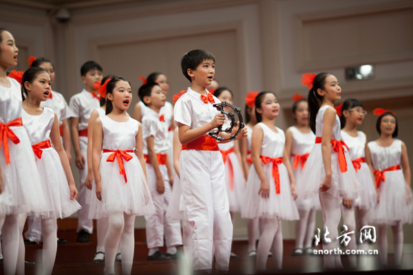 天津北方网讯:12月16日,“共享和平阳光”2015年和平区中小学合唱音乐会暨和平区艺术教育成果展示在天津音乐厅举行,来自和平青少年宫小白鸽合唱团及岳阳道小学、鞍山道小学、天津市实验小学及第二十一中学的合唱团队相继登台献艺,为观众带来艺术享受。(王英浩摄)