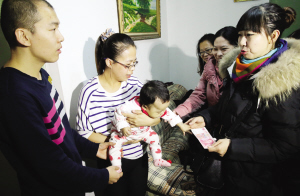 “暴走爸爸救女”的故事,赢得无数人关注,为宋宏磊的父爱“点赞”,其中全国各地不少人捐款给这个家庭,更打动了本市不少爱心市民和公益组织,掀起一股津鲁爱心接力潮。上午天津义务服务队的爱心妈妈将捐款送到了宋宏磊手中,“既然来到了我们天津治病,我们就要更好地帮助他们。”