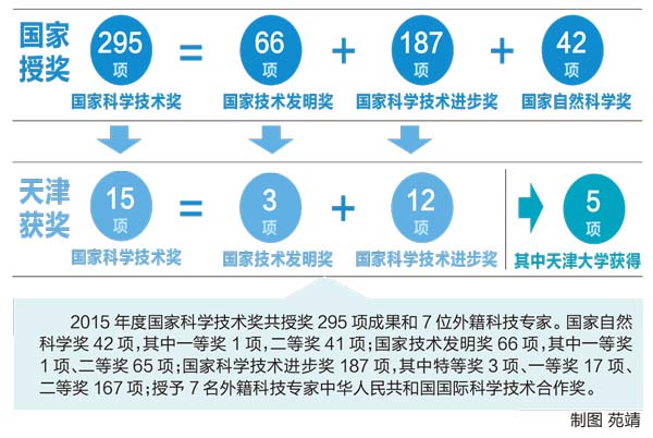 昨天,2015年国家科学技术奖励大会上传来消息,天津大学为第一完成单位的5项成果分获国家技术发明二等奖(1项)和国家科技进步二等奖,获奖总数在国内高校中名列前茅。获奖项目中的4项是由天津市推荐,2个项目在多项天津市自然科学基金重点项目及天津市科技计划项目的大力支持下完成。