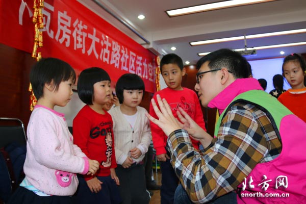 天津北方网讯:“我知道!”、“让我来回答!”……一声声童声伴着一双双高举的小手,让河西区下瓦房街大沽路社区的“活力空间”原本就具备的活力味儿更浓郁了。2月2日下午,北方网新媒体记者刚走进大沽路社区居委会二楼的“活力空间”,便被这种暖暖的氛围所包围,来自于天津师范大学、天津理工大学的青年志愿者们根据所学专业的特点和自身特长分组对社区20多名中小学生开展趣味英语、手工剪纸、快乐阅读等活动。