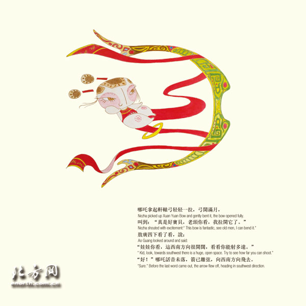 中英双语的文字设计,是为了绘本可以在更广泛的领域推广。宗帅说:“《哪吒与海》的绘本完全按照国际通行的绘本规格设计、制作。目前绘本在香港发行很好,首印2000册,第一天面市就卖了200册,还要加印。日本市场我们也正在接触,《圣斗士》漫画的编辑很看好这个绘本,会在日本做推荐。”