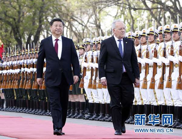 会谈前,习近平在人民大会堂东门外广场为施奈德-阿曼举行欢迎仪式。全国人大常委会副委员长沈跃跃、国务委员杨洁篪、全国政协副主席王钦敏等出席。
