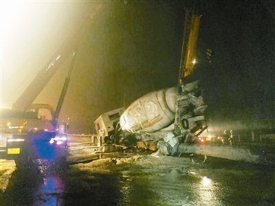 记者在现场看到,水泥搅拌车侧翻在马路上,车体损毁严重。桥面上有大量泥浆,无法正常通行。桥栏杆损坏,现场一片狼藉。据司机介绍,当时他为了躲避其他车辆紧急打轮,随后失控撞向桥护栏并发生侧翻。事后他自己从车中爬出,幸无大碍。消防队员、交警等迅速赶到现场,直至4时许,现场才基本清理完毕,道路交通逐渐恢复。