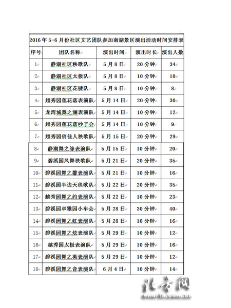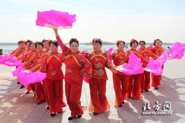 天津北方网讯:为了满足游客对景区文化艺术等精神层次的需求,提供给游客丰富多彩的文化盛宴,南湖·绿博园景区特邀下朱庄街社区文艺团队自2016年5月8日起至2016年6月5日每周六、日在南湖景区水秀平台进行文艺汇演。