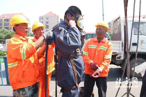 在红桥区佳庆道与双环路交口,前沿新闻记者看到排水工作人员穿好防护设备、戴上防毒面具,进入深5、6米的排水井,开始大管网的清淤工作。“我们正在进行的是主干管网的清淤,因为管径较大,有一定的自净功能,每五年进行一次清淤,而这个管道正处在交通要道,为保障通行,只能选择人工清淤。”天津市水务局排管处计划科副科长熊伟告诉前沿新闻记者。