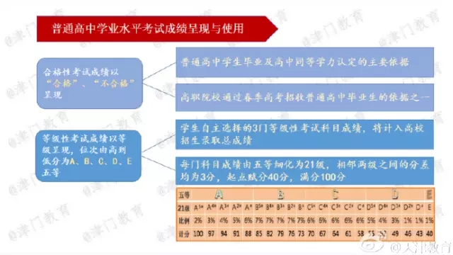 等级性考试成绩在计入高校招生录取总成绩时,每门科目成绩由五等细化为21级。其中,A为满分100分,E计40分,相邻两级之间的分差均为3分。