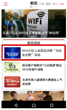 2016年3月18日,“小巨人走进达沃斯”活动正式启动。经过现场调研、综合评定和网络投票,最终选拔出8家天津小巨人企业参加2016天津夏季达沃斯论坛。6月8日,“前沿”客户端推出“点赞”活动,请广大网友从选拔出的8家天津小巨人企业中,选择支持的企业进行“点赞”。