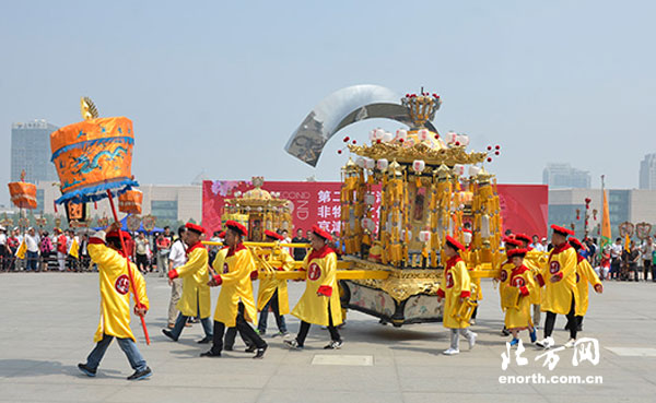 天津北方网讯:为贯彻落实京津冀协同发展重大战略和党的十八届五中全会提出的“构建中华优秀传统文化传承体系,加强文化遗产保护,振兴传统工艺”的新要求, 6月9日,由文化部非物质文化遗产司支持,天津市文广局、北京市文化局、河北省文化厅主办,京津冀三省市非遗保护中心、天津美术馆承办的“第二届京津冀非物质文化遗产联展”在天津市美术馆盛大开幕,津南区“葛沽宝辇出会”、“葛沽长乐老高跷”、“海下同善文武高跷”、“麦秸画”等非遗项目受邀参与此次活动。