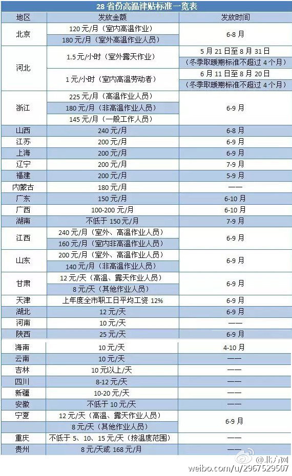 入夏两个月以来,我国各地气温居高不下,气象台多次发布高温预警。8月4日,有“冷极”之称的内蒙古自治区呼伦贝尔市部分地区最高气温一度达到44.1℃,创历史极值。即便如此,很多人仍要冒着酷暑继续工作,高温补贴无疑成了大家关注的焦点。记者发现,在各省高温补贴中,按月计发津贴的省份中,山西省标准最高,为240元/月;按天发放则是天津27.3元/天位居榜首;而发放时间最长的则为7个月的海南。