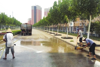 图④为工作人员清洗路面。