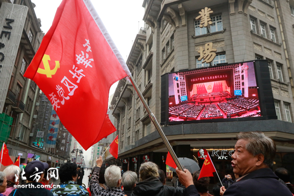 和平区不少市民自发来到滨江道与和平路交口,在蒙蒙细雨中,通过大屏幕观看十九大开幕盛况