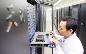 天津北方网讯:在超算中心二楼的机房区内,整齐地摆放着百余个一人多高的机柜。机柜的正对面是一个约10平方米的监控室,有工作人员24小时在这里轮班值守,这里就是冯景华和他的同事工作的地方。