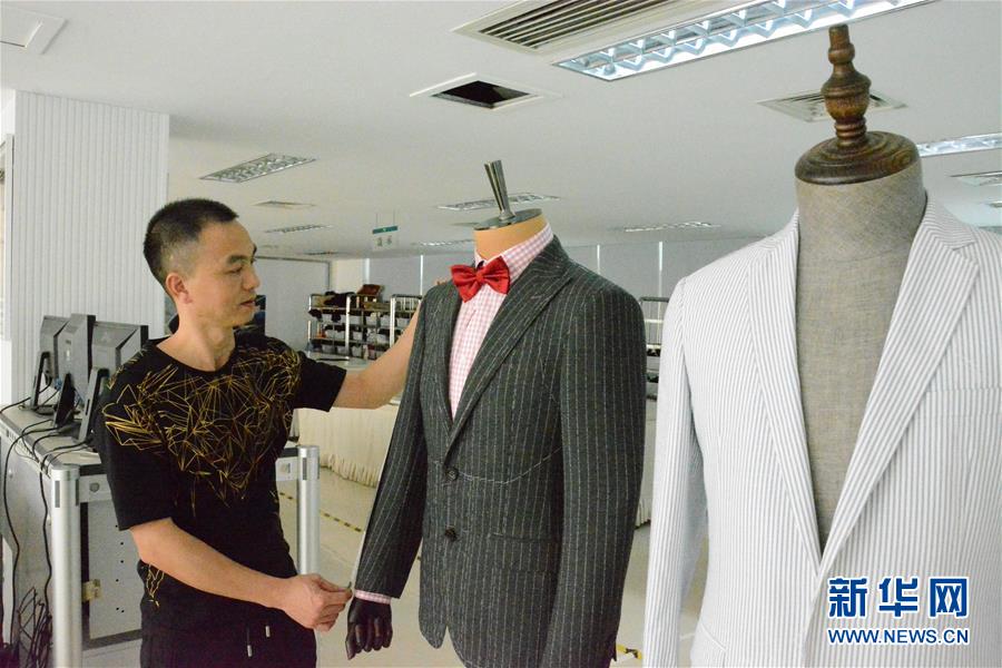 10月17日,在福建省七匹狼实业股份有限公司晋江生产基地技术中心,首席技能指导师胡牛崽检查新的服装版型。