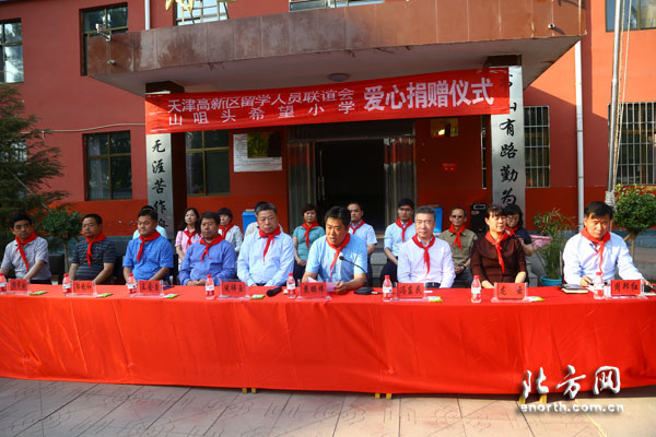 2009年,天津高新区两委领导和高新区欧美同学会的企业家共同为山咀头希望小学揭牌,并捐款10万元,为孩子们送去了电脑、文具、图书等学习用品。八年来,这种捐助从未间断,这种看望从未停止,而且越来越多的企业家加入捐赠和慰问的队伍中,希望小学的孩子们亲切地称他们为“天津高新区的亲人们”。阜平县副县长刘婷说:“天津高新区多年来一直不间断的帮助援建山咀头希望小学,使这所条件落后的学校转变成全县硬件条件最先进的小学之一,这在我们阜平县教育发展历程中是一件不平常的大事。”