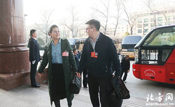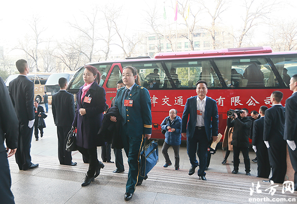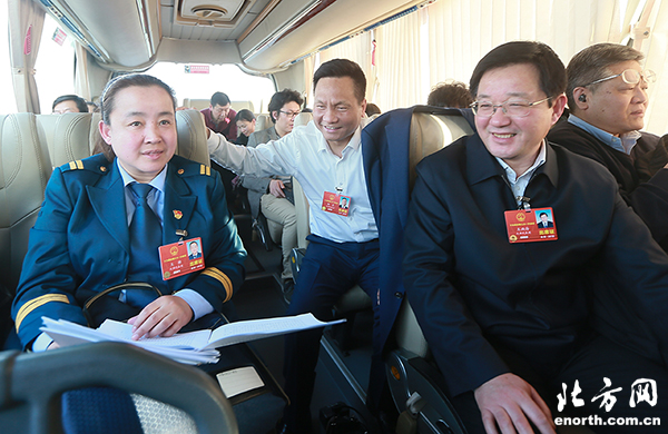出席十三届全国人大一次会议的天津代表在赴京途中热烈交流