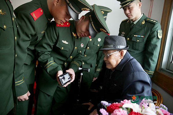 官兵们为老人播放中国军网发布的《厉害了,我的军》强军宣传片。