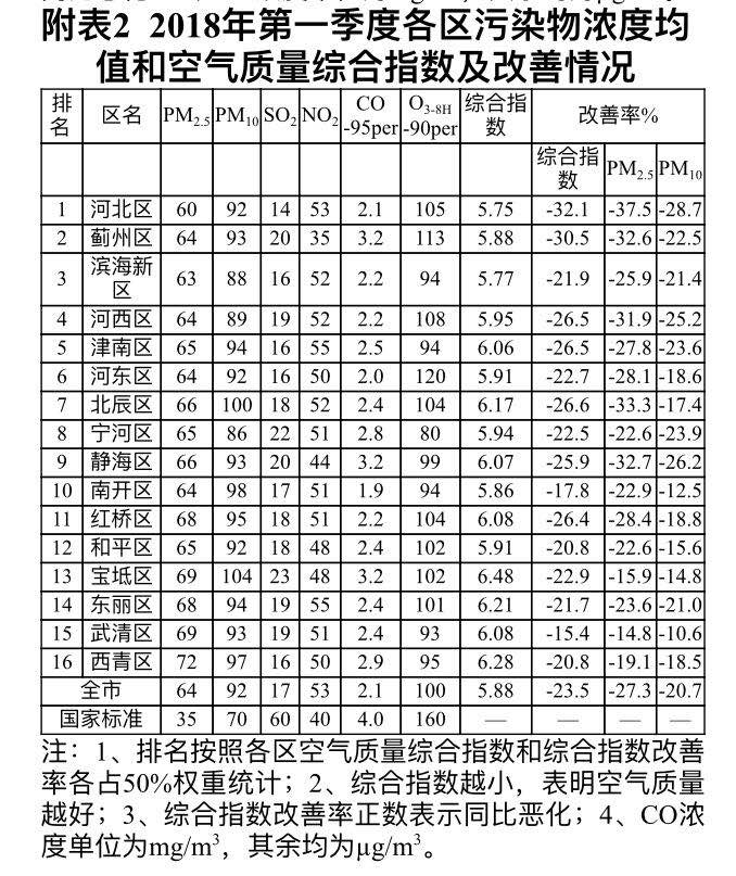 2018年第一季度,各区空气质量综合指数在5.75~6.48之间,按照综合指数和综合指数改善率各占50%权重进行排名,第一季度排名较好的区为河北区、蓟州区和滨海新区,较差区为西青区、武清区和东丽区。(津云新闻记者董立景)
