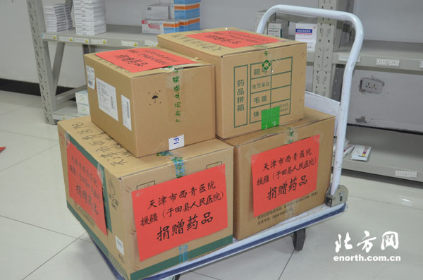 在援疆一年期间,张茂林医生被任命为于田县人民医院副院长,他通过亲身体验,深深了解了当地医疗资源的紧缺及常见病对症药物的缺乏。前期他通过与西青医院党委汇报,医院领导非常重视,及时召开党委会议商议研究,并请示西青卫计委党委研究通过。在得到回复后,医院积极组织相关科室在第一时间对那里所需药品进行了准备,于3月26日准备将新疆于田县人民医院所需的价值两万余元的24种药品邮寄,到邮局才了解到,药品的邮寄方面存在很大困难。按照国家相关规定,药品邮寄只能是少量的非处方药品,如此大量的药品是不能邮寄的。医院领导得知此事后,责成药剂科负责人想尽一切办法解决。在药剂科潘主任的多方努力与协调下,通过两地相应调拨方式,近期终于把药品如数安全送到了于田县人民医院,解决了他们的燃眉之急。