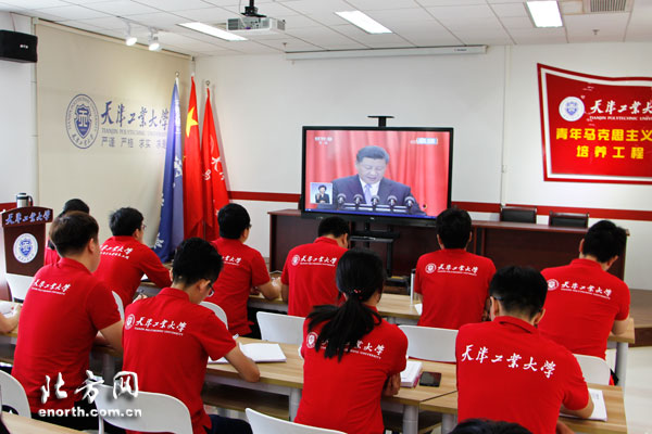 天津北方网讯:5月4日上午10点,纪念马克思诞辰200周年大会在人民大会堂举行。中共中央总书记、国家主席、中央军委主席习近平出席大会并发表重要讲话。天津各高校干部师生通过网络、电视、广播等媒体收听收看了纪念大会,并对习近平总书记的重要讲话展开了热烈讨论。大家纷纷表示,青春需要奋斗!作为中国特色社会主义事业的建设者和接班人,广大青年要始终坚持高举马克思主义伟大旗帜,要像总书记教导的那样:“把读马克思主义经典、悟马克思主义原理当作一种生活习惯、当作一种精神追求,用经典涵养正气、淬炼思想、升华境界、指导实践。”,为实现“两个一百年”奋斗目标和中华民族伟大复兴的中国梦而不懈奋斗。