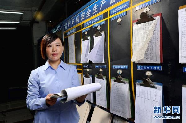 胡小燕在曾经工作过的陶瓷厂检查职工权益保护工作(2013年11月5日摄)。2008年1月,在广东佛山一家陶瓷建材企业打工的胡小燕在有3000多万农民工的广东省高票当选,成为首位农民工全国人大代表。新华社记者 刘大伟 摄