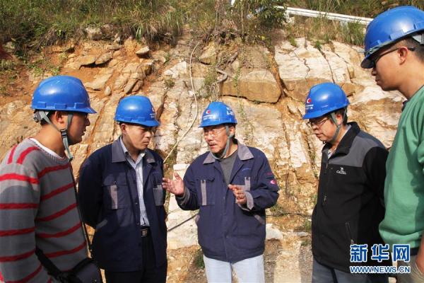 南仁东(左三)与工程技术人员在位于黔南州平塘县的大窝凼施工现场检查施工进展(2014年12月1日摄)。新华社发(中科院国家天文台供图)