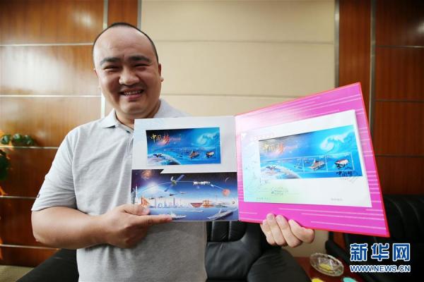 “蛟龙号”载人潜水器首席潜航员叶聪在无锡邮政局举办的《中国梦-国家富强》特种邮票首发现场展示邮票(2013年9月29日摄)。 新华社发