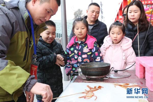 2月7日,市民在河北省邯郸文化大集上观看民间艺人制作糖画。春节假期,人们走出家门体验多姿多彩的民俗文化活动,感受浓浓的年味儿。新华社发(杨扬摄)