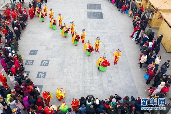 2月6日,民间艺人在河北省石家庄市正定县古城内表演跑竹马(无人机拍摄)。春节假期,人们走出家门体验多姿多彩的民俗文化活动,感受浓浓的年味儿。新华社发(苏阳摄)