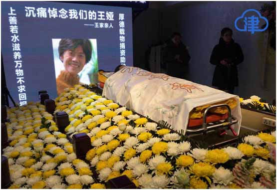 市红十字会负责人在致悼词中称赞道,“王娅牺牲完整的身体,在离开世界后做了一件功德无量的善事,延续不仅是一个个生命,而且还是一个个家庭,这是一种大爱。”哀婉的乐声在礼堂里回响。上百名社会各界爱心人士与王娅亲属肃立默哀,向王娅灵柩再三鞠躬。接着,围着灵柩缓步绕行一周,向王娅最后送别。