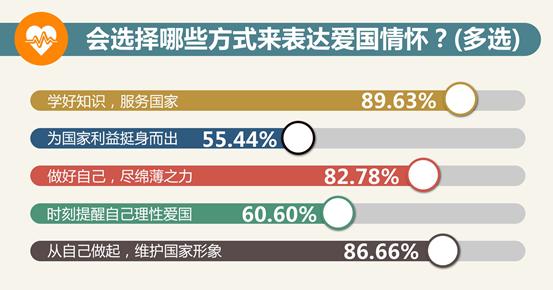 大学生表达爱国的方式更加务实,94.03%的受访者认为“理性爱国是最好的方式”。超过80%的大学生认为爱国要先从自己做起,“学好知识、服务国家”“做好自己,为社会尽绵薄之力”等成为很多大学生的首选。陕西师范大学学生强德平说,爱国有三点,第一是铭记历史,第二是展望未来,第三是把握当下。中国人民大学学生张啸寒说,走到人民生产实践的第一线,是关心国家和社会的最好方式。