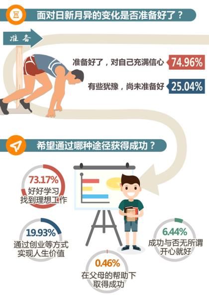 大学生的自信还体现在希望通过努力获得成功。93.1%的受访者希望“好好学习,从事理想工作”“通过创新、创业等方式实现人生价值”。在采访中,不少大学生表示“只要有想法就敢去做”“相信未来有无限可能”。中国地质大学(北京)信息工程学院兼职辅导员王洪宇说,现在的大学生不拘泥于传统,更愿意参与创新创业,他们甚至会自己创立新工种,把青年特质发挥到极致。分析认为,这一代大学生成长在国家快速发展、改革开放不断深化、国际地位不断上升、互联网与生活紧密融合的时代,他们的成长环境更加优越,视野更加开阔,这对他们的自我认知及性格形成有很大影响,他们更加自信。