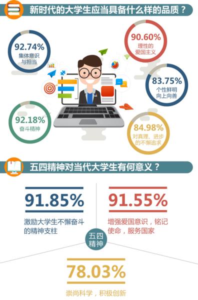 数据显示,98.79%的受访者认为“五四精神永不过时”,92.74%的受访者认为“新时代大学生应该具备集体意识与责任担当”,84.98%的受访者认为“大学生要坚持对真理、进步的不懈追求”。北京大学学生张栋杰说,新时代需要努力奋斗,一是为个人有更好的成长和发展,二是为时代变得更好,国家变得更强。浙江大学学生邵晋涵说,毕业后,我要到祖国最需要的地方去,让自己的青春发光发热。华南理工大学学生卓玛拉吉说,只有我们奋斗过、拼搏过,我们的青春才会有收获。海南师范大学学生张作琴说,青春更多是一种敢于追梦的起点,是一种无怨无悔的奉献。