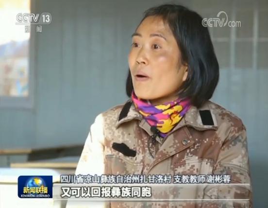 四川省凉山彝族自治州扎甘洛村支教教师 谢彬蓉:我在这几年,是见证我们国家政策(多么好),我们的新教室也是都修起来了,教学条件也改善了,我们作为退役军人,能够把自己以前部队那种艰苦、奉献、特别能战斗的那种精神,来协助这些彝族同胞,一起走在我们脱贫攻坚的道路上,我觉得我有幸能在这样的时代,能够做这样的一些事情,特别开心。