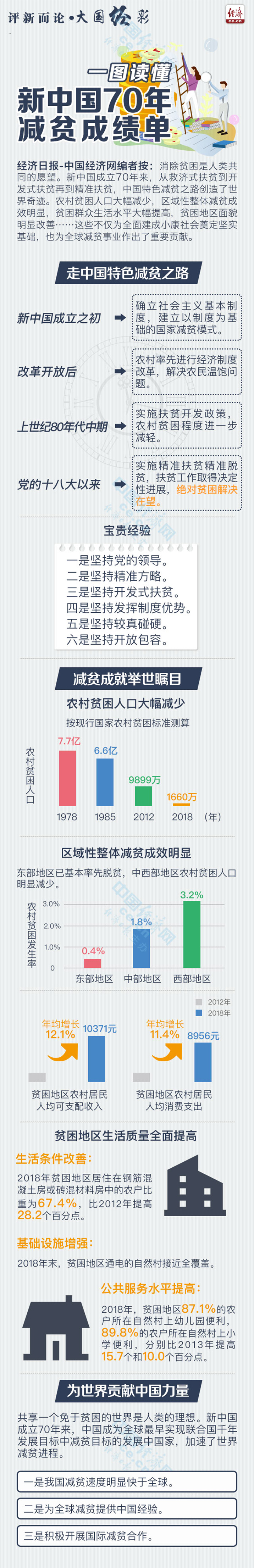 内容提要:消除贫困是人类共同的愿望。新中国成立70年来,从救济式扶贫到开发式扶贫再到精准扶贫,中国特色减贫之路创造了世界奇迹。农村贫困人口大幅减少,区域性整体减贫成效明显,贫困群众生活水平大幅提高,贫困地区面貌明显改善……这些不仅为全面建成小康社会奠定坚实基础,也为全球减贫事业作出了重要贡献。