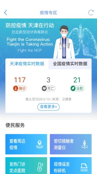 目前,“津心办”的疫情防控服务专区已经上线了“查看周边疫情”、“密切接触者测量仪”、“发热门诊定点医院”、“疫情谣言粉碎机”、“疫情智能助手”、“患者相同行程查询”、“防护用品生产企业查询”、“新型肺炎科学预防”等8项便民服务功能,并开设了天津及全国疫情实时数据查询、中英文双语动态发布,健康科普等专栏。