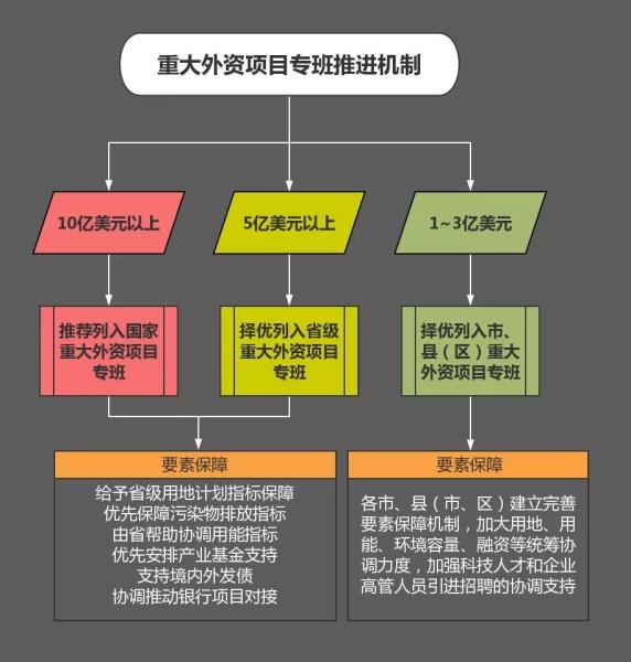 其次,强化工作机制保障。建立国家重大外资项目专班为引领的省市县三级重大外资项目专班机制,加强上下联动、部门协同和协调服务。按照总投资10亿美元、5亿美元、1-3亿美元标准分类,择优选择列入国家重大外资项目专班、省级专班和市、县(区)专班,推荐列入省重大产业项目和省市县长项目。