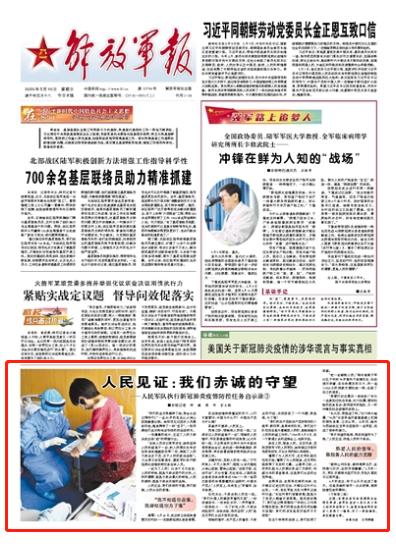 “全体人员牢记我军宗旨,始终坚持人民利益高于一切,把人民群众生命安全和身体健康放在第一位,展现了人民子弟兵忠于党、忠于人民的政治品格”。习主席日前签署通令,嘉奖军队执行新冠肺炎疫情防控任务全体人员。